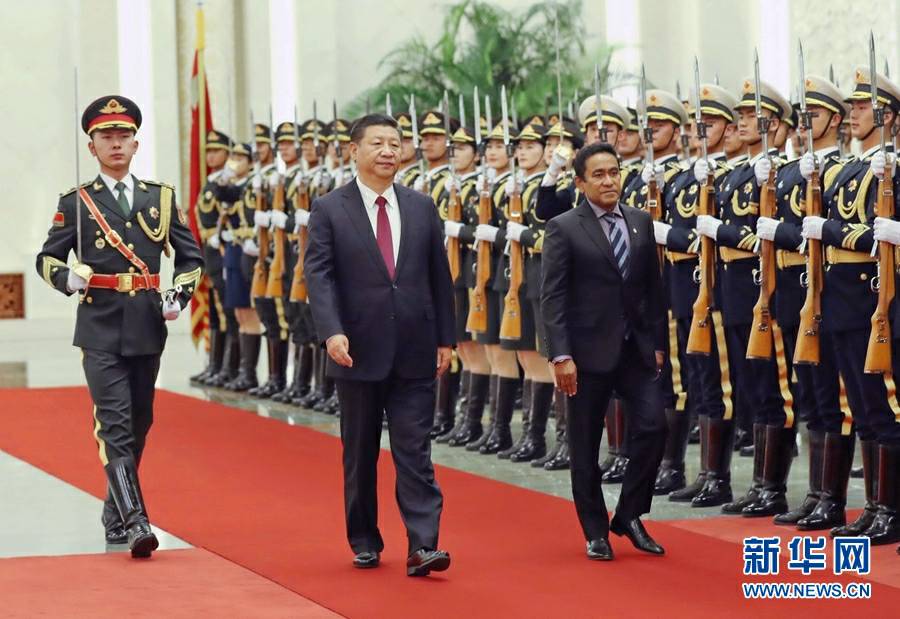 12月7日,国家主席习近平在北京人民大会堂同来华进行国事访问的马尔代夫总统亚明举行会谈。这是会谈前,习近平在人民大会堂北大厅为亚明举行欢迎仪式。新华社记者 庞兴雷 摄