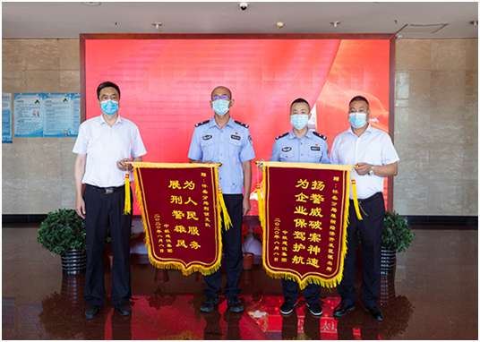 培训中心主任孔德明代表星空官方端网站登录入口-星空online(中国)向怀柔分局雁栖经济开发区派出所所长和怀柔分局刑侦支队支队长送上锦旗,代表公司感谢人民警察服务企业生产建设、守护一方平安付出的艰辛努力,感谢怀柔分局雁栖开发区派出所和怀柔分局刑侦支队急企业所急、想人民所想,在企业遇到困难时及时出警,有力保障了企业财产安全,维护了社会良好秩序,为企业发展创造了平安和谐的营商环境。